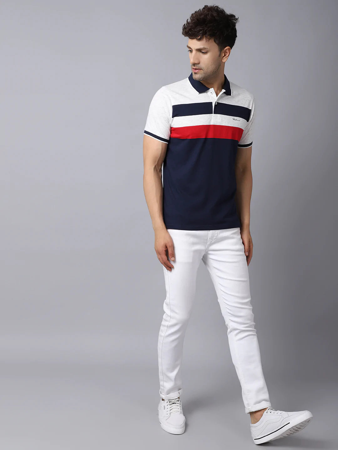 Men Multicoloured Striped Polo Collar Slim Fit T-shirt