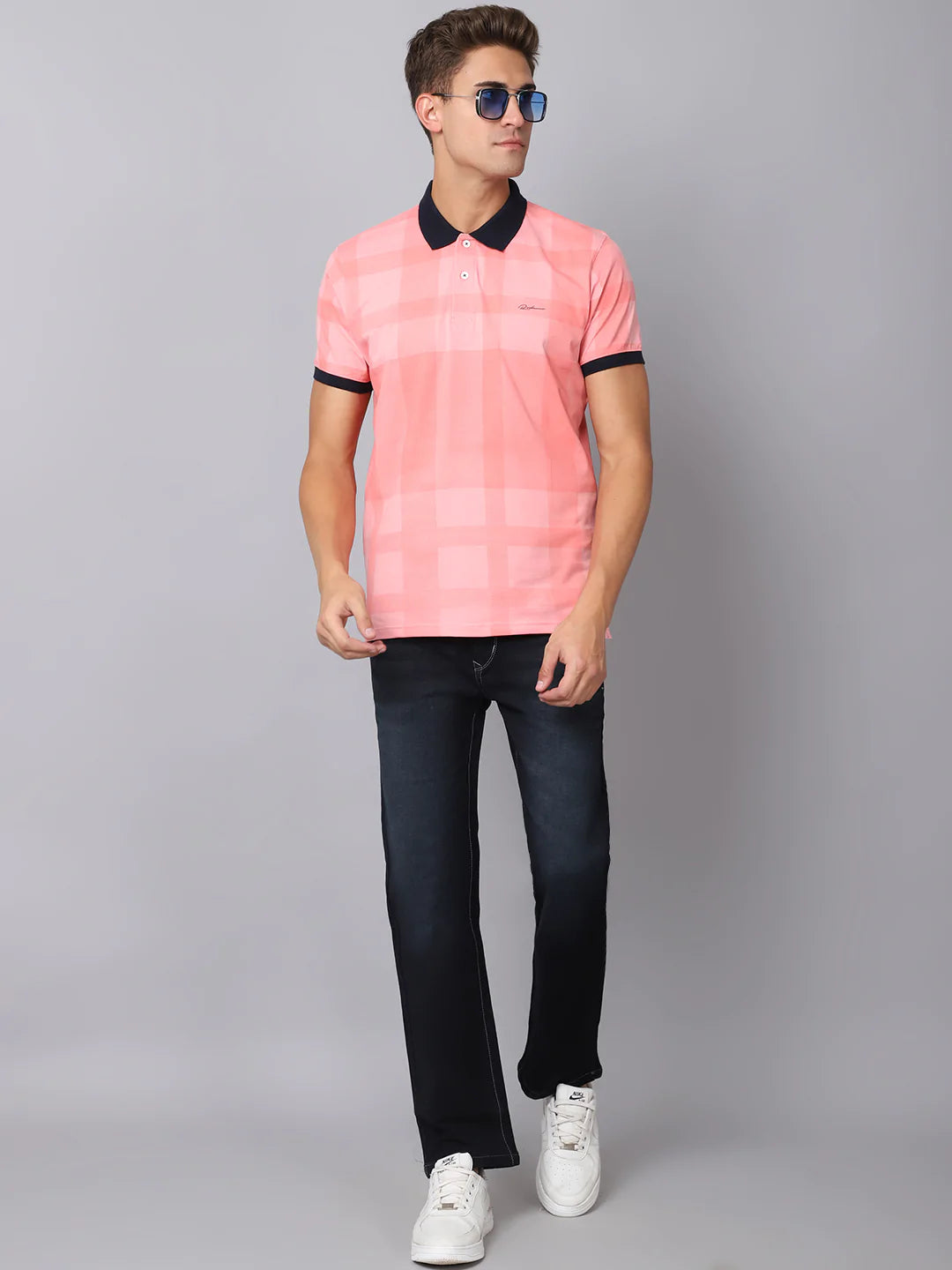 Men Pink impatiens pink Checked Polo Collar Slim Fit T-shirt